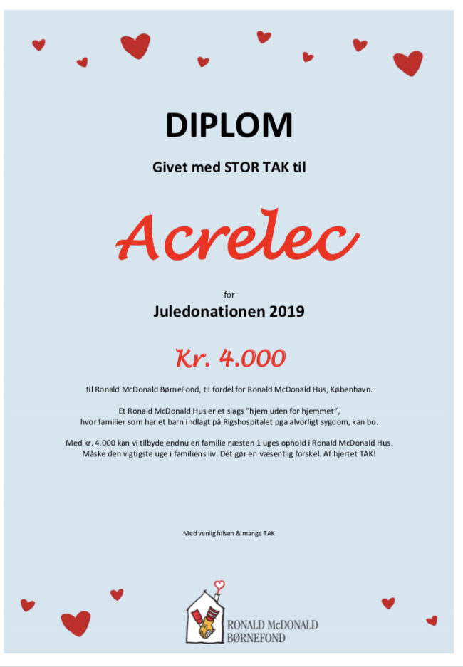 Derfor bliver vi ekstra glade for de donationer som Ronald McDonald BørneFond modtager fra både privat personer og virksomheder, i netop denne tid. Som f.eks. donationen vi netop har modtaget fra Acrelec. Tak til Acrelec, med jeres donation kan vi tilbyde endnu en familie, næsten en hel uges ophold i Ronald McDonald Hus. Måske netop…